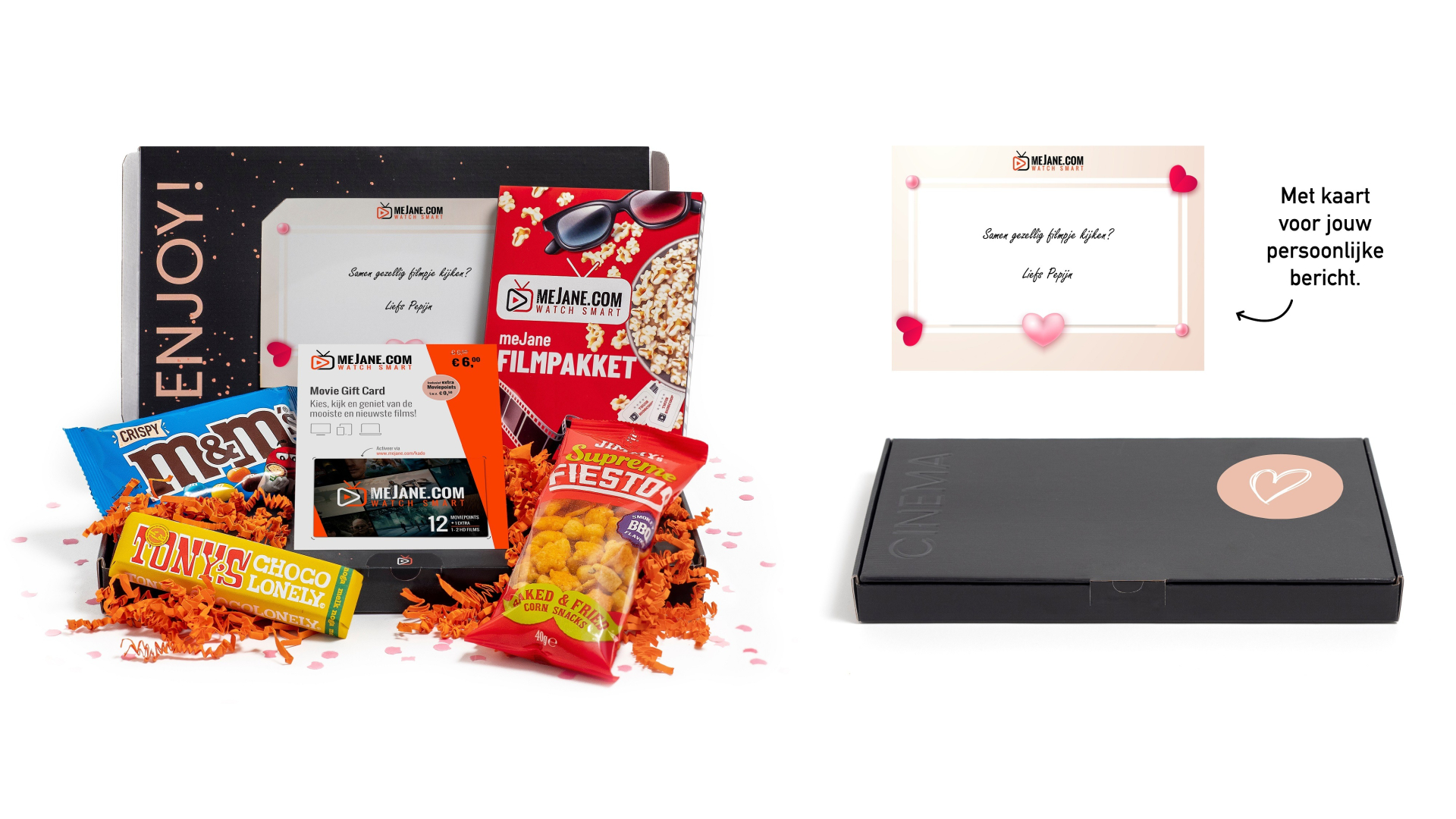 Geef iemand een mooie filmavond cadeau met meJane! Een filmkaart en lekkers gewoon in de brievenbus, mooi verpakt en met als je wilt een persoonlijk berichtje.
